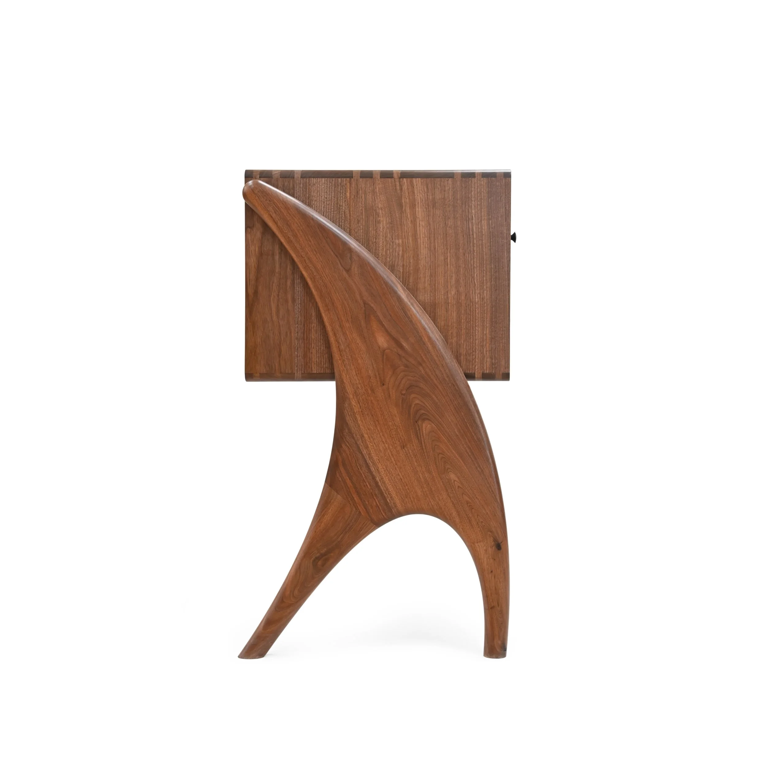 Designed and crafted at our Chicago studio, the HiFi Credenza is the perfect storage solution for your modern space. Crafted from solid Walnut wood and featuring hand-cut dovetail construction with hand-turned Ebony wood pulls, this case piece is a timeless and intended to last generations. The strong lines and subtle curves of the HiFi Credenza lends itself to a modern aesthetic, but also looks great in a more traditional setting. Its standard design features two large drawers and two spaces with doors, all featuring high-quality soft-close hardware. Imprinted ‘Drake’ along with the date and number on the back side.